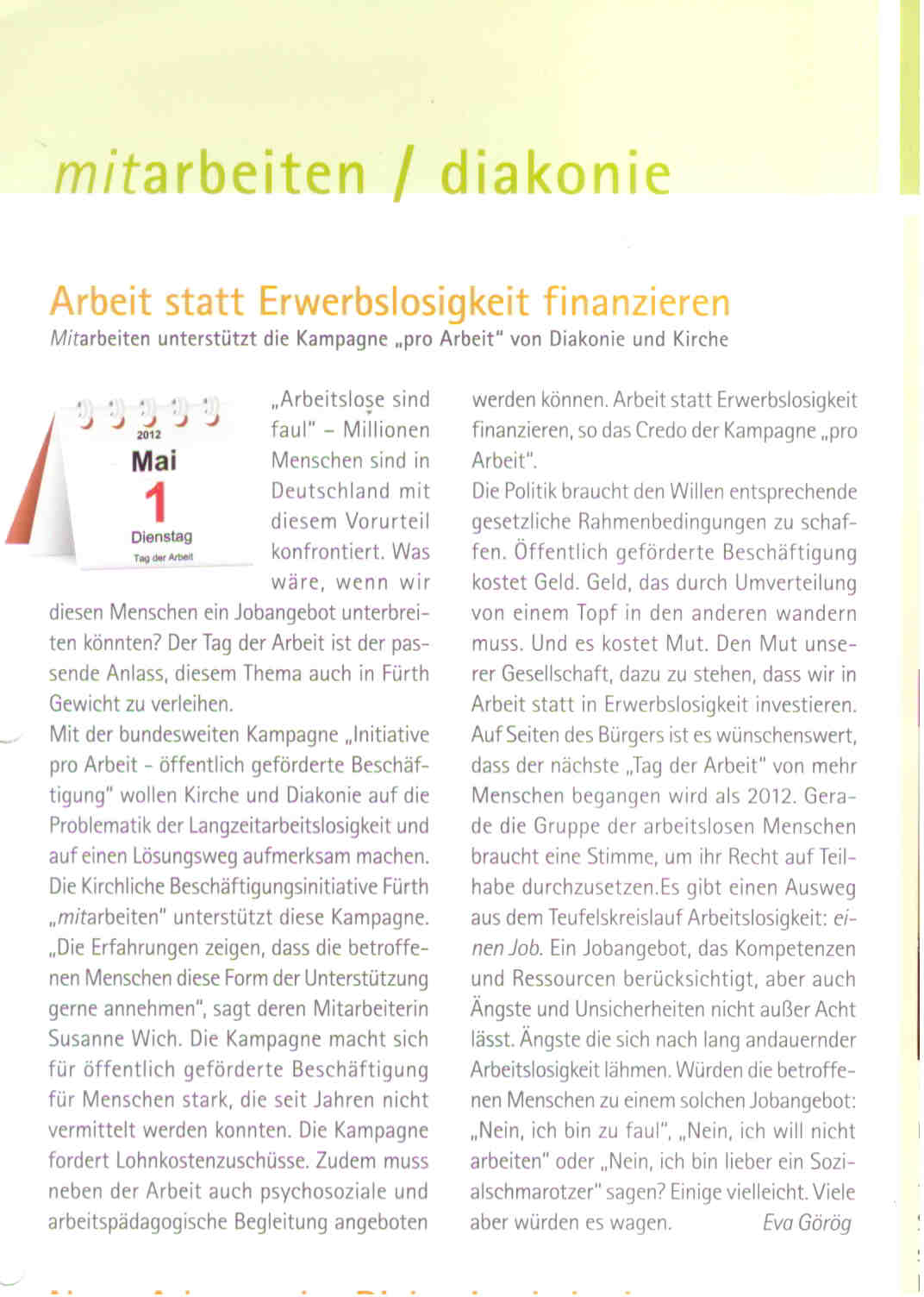 Artikel zur Kampagne „Pro Arbeit“ im Monatsgruß Mai 2013