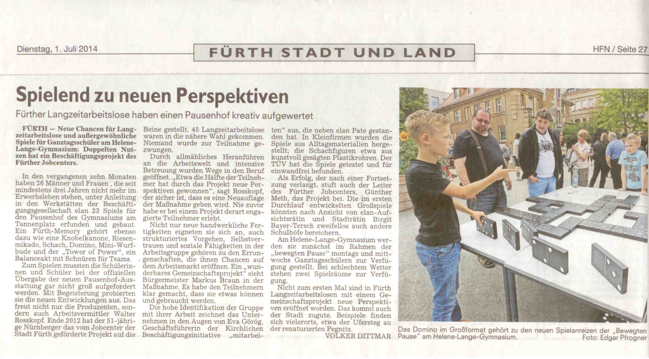 Präsentation unseres Projekts LEO 1 in Kooperation mit elan - Zeitungsartikel in den Fürther Nachrichten vom 01.07.2014