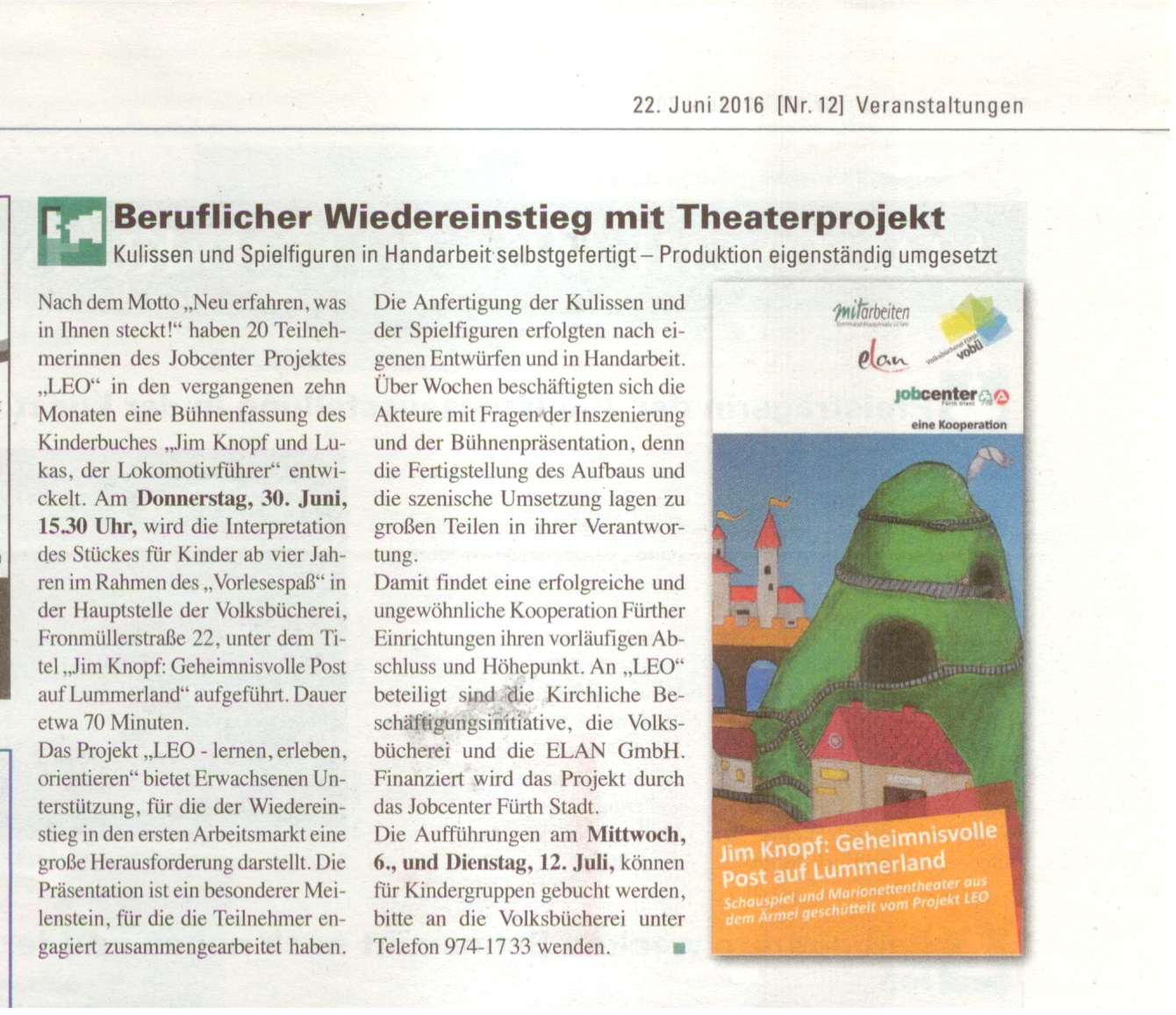 Präsentation unseres Projekts LEO 3 in Kooperation mit elan - Zeitungsartikel aus der Fürther Stadtzeitung vom 22.06.2016
