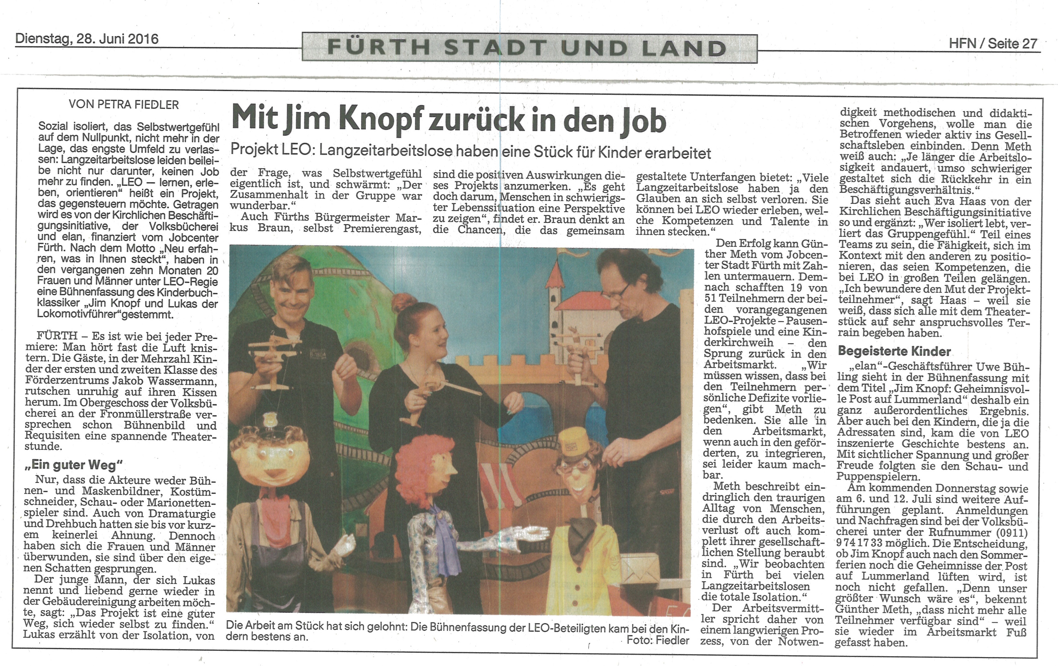 Präsentation unseres Projekts LEO 3 in Kooperation mit elan - Zeitungsartikel aus den Fürther Nachrichten vom 28.06.2016
