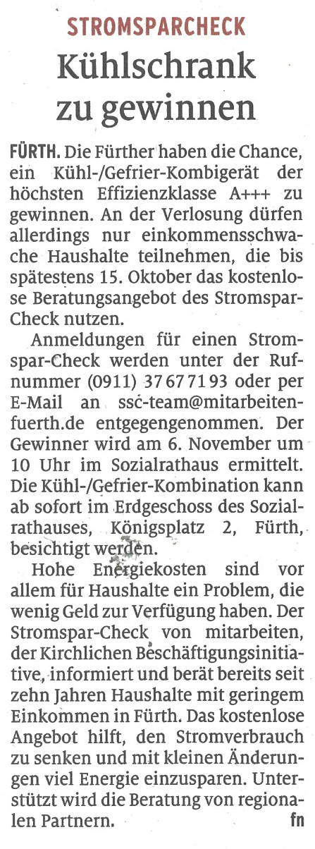 Unser Stromspar-Check verlost einen Kühlschrank - Artikel in den Fürther Nachrichten vom 09.09.2019