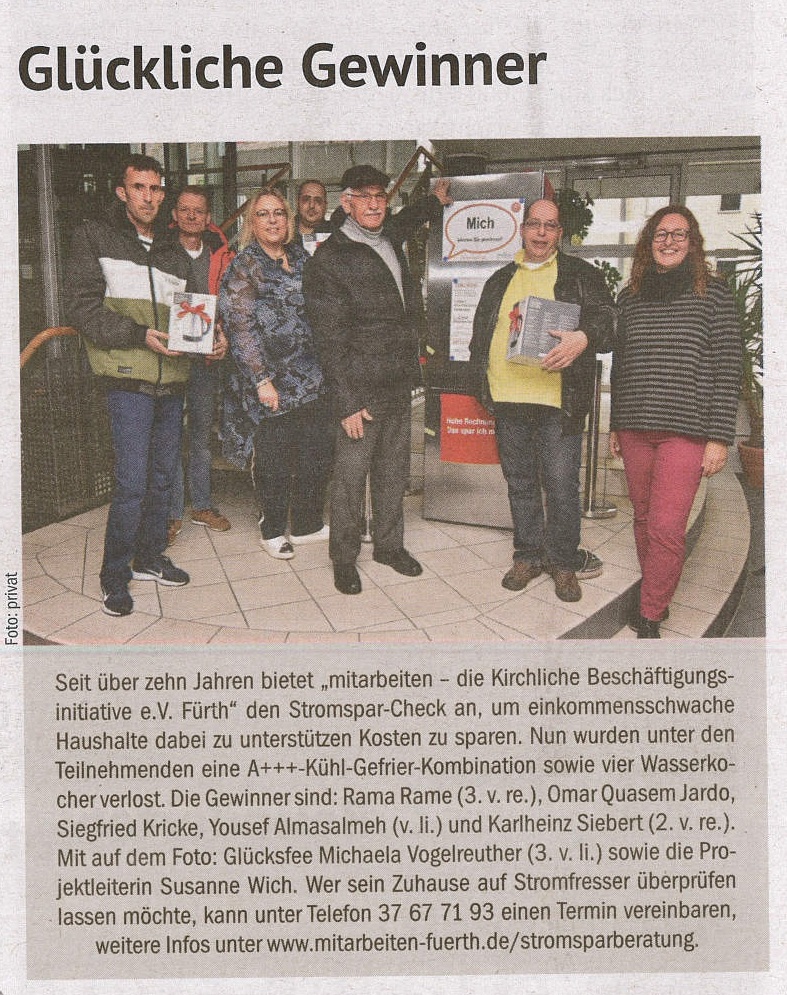Verlosung des Kühlschranks und Ziehung des Gewinners durch unser Projekt Stromspar-Check - in den Fürther Nachrichten am 08.11.2019
