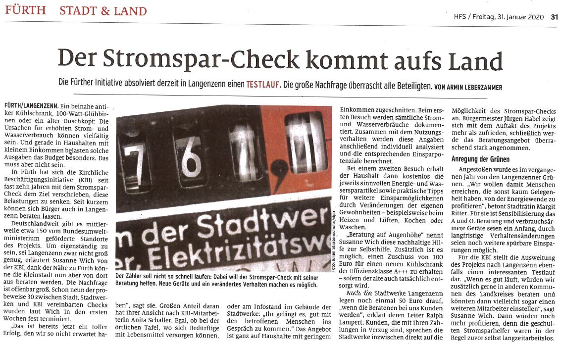 Unser Projekt Stromspar-Check startet in Langenzenn - Artikel in den Fürther Nachrichten vom 31.01.2020