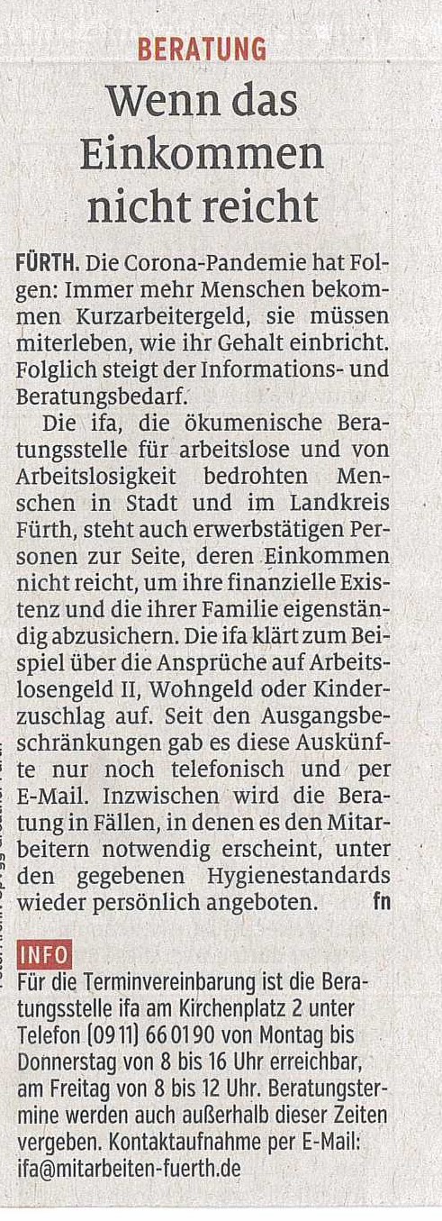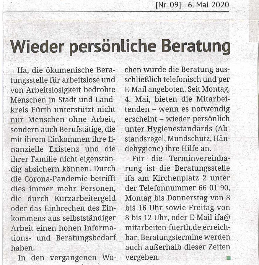 Unsere Beratungsstelle für arbeitslose Menschen „ifa“ nimmt die persönliche Beratung wieder auf - Artikel in den Fürther Nachrichten vom 11.05.2020