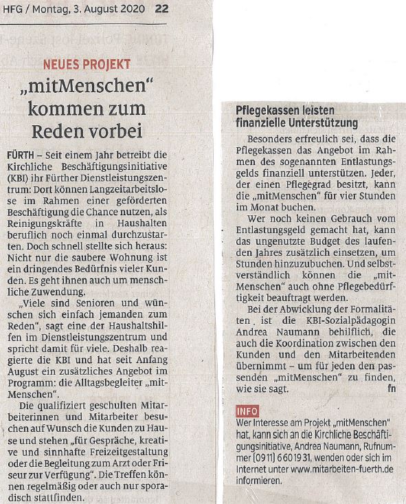 Unser neues Projekt „mitmenschen“ geht an den Start - Artikel in den Fürther Nachrichten vom 03.08.2020