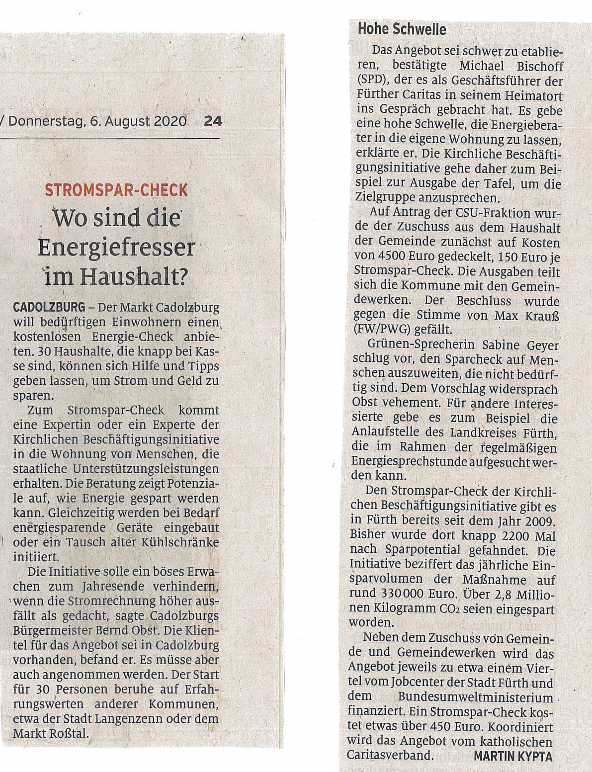 Unser Projekt Stromspar-Check startet in Cadolzburg - Artikel in den Fürther Nachrichten vom 06.08.2020