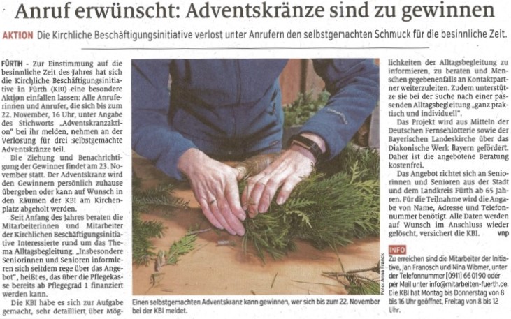 „Alltagsbegleitung ins Licht gerückt“ verlost Adventskränze - Artikel in den FN vom 09.11.2022