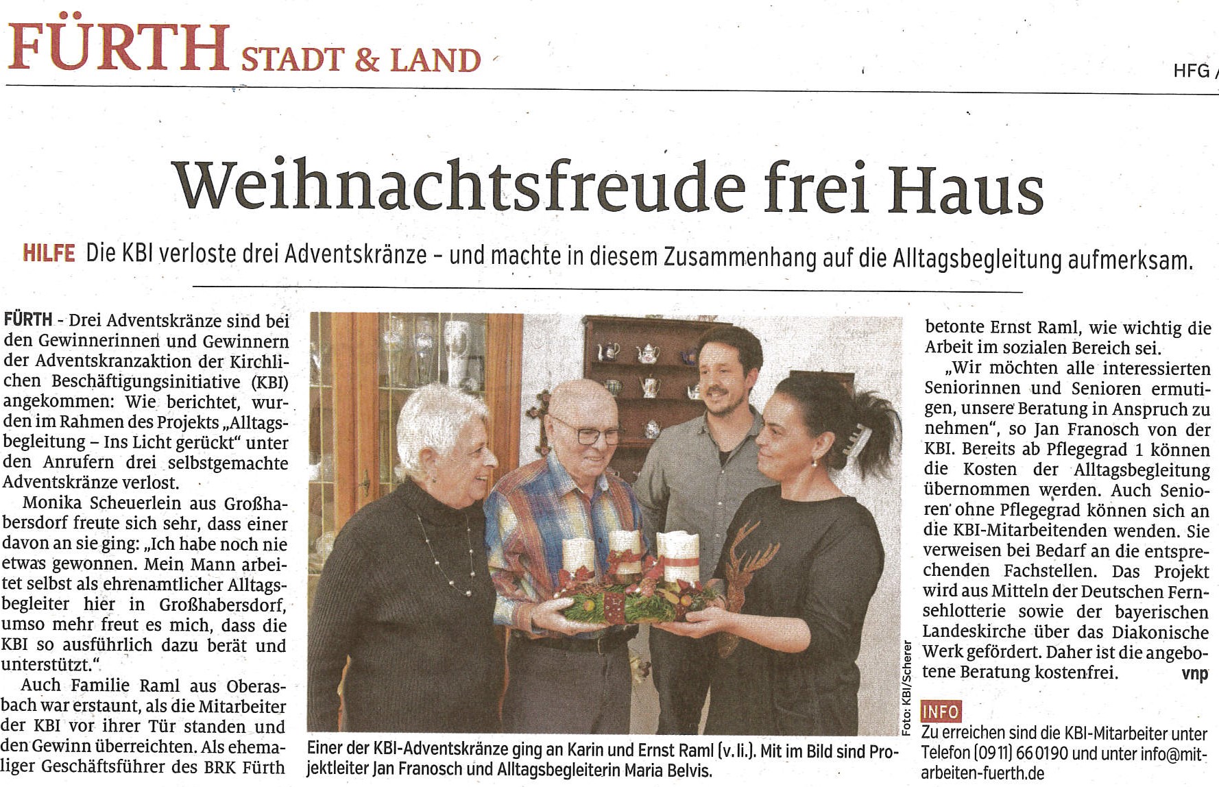 Das Projekt „Alltagsbegleitung ins Licht gerückt“ wird dank einer Spende der „Stiftung Antenne Bayern hilft“ fortgesetzt - Artikel in den Fürther Nachrichten vom 24.12.2024