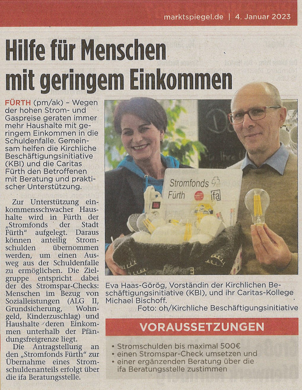 Spendenaufruf für den Stromfonds Fürth - Artikel im Marktspiegel vom 04.01.2023