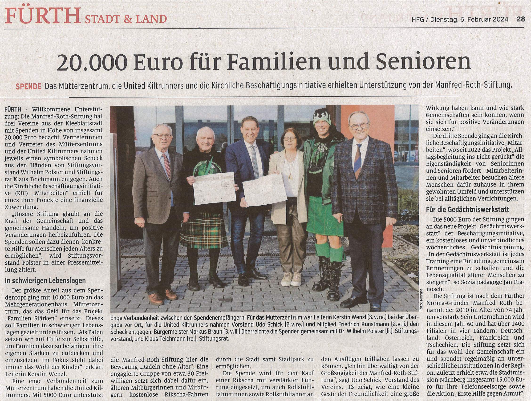 Spende der Manfred-Roth-Stiftung für unser Projekt Alltagsbegleitung ins Licht gerückt - Artikel in den Fürther Nachrichten vom 06.02.2024