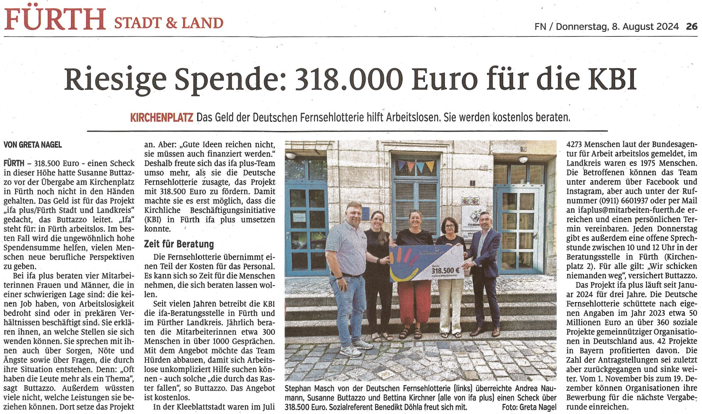 Übergabe der Spende der Deutschen Fernsehlotterie für das Projekt ifa+ - Artikel in den Fürther Nachrichten vom 08.08.2024