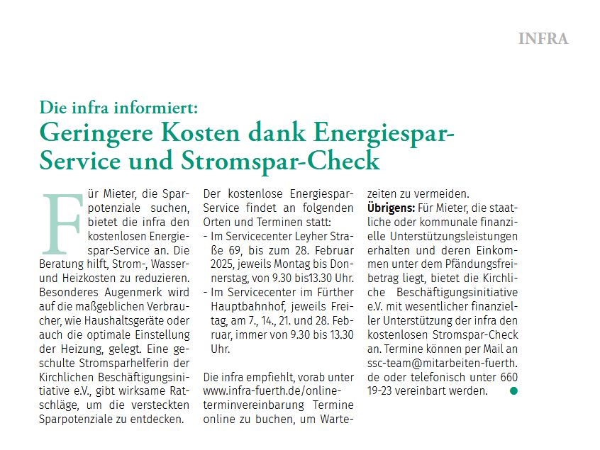 Geringere Kosten dank Energiespar-Service und Stromspar-Check - Artikel in der INFÜ vom 29.01.2025