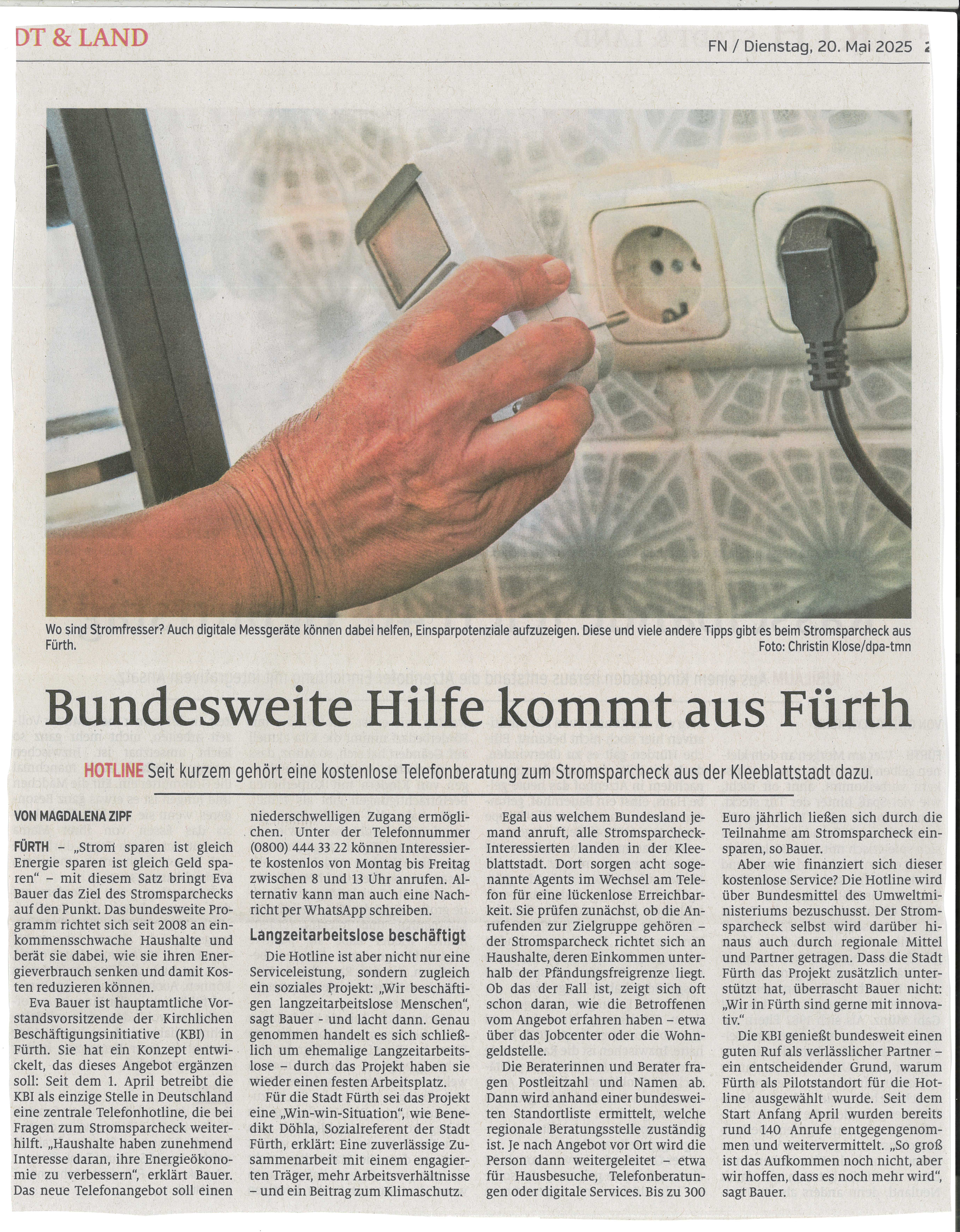 Bericht über die bundesweite Telefonhotline des Stromspar-Check mit Sitz in Fürth bei der KBI - Artikel in den Fürther Nachrichten vom 20.05.2025