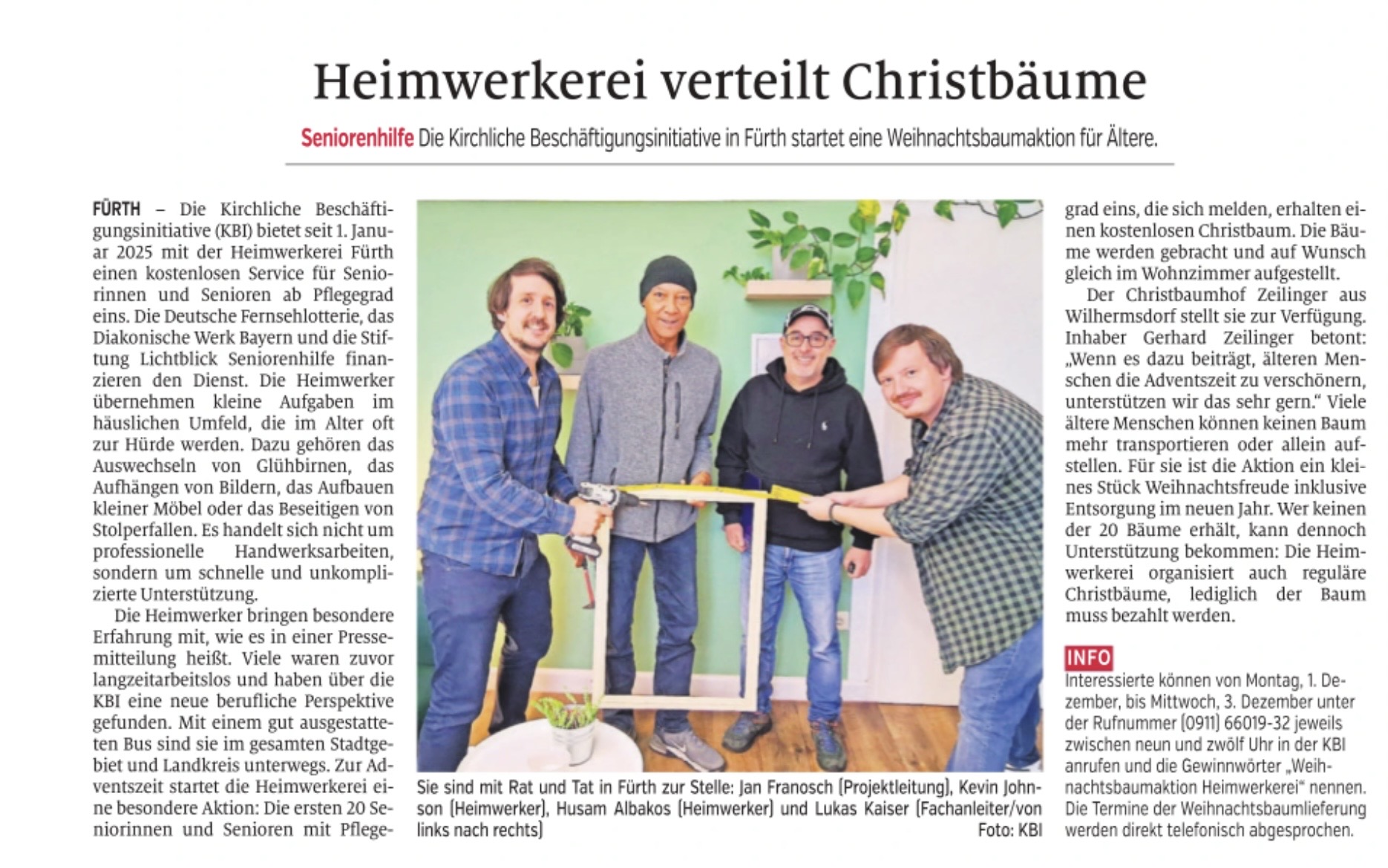 Bericht über die Verteilung von Weihnachtsbäumen durch die Heimwerkerei Fürth - Artikel in den FN vom 28.11.25